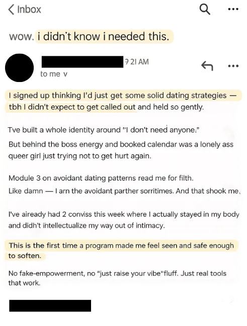 Then in 2023, I stopped spiraling and built the Secure Dating Framework — a nervous-system-first method that replaced overgiving with grounded clarity.
